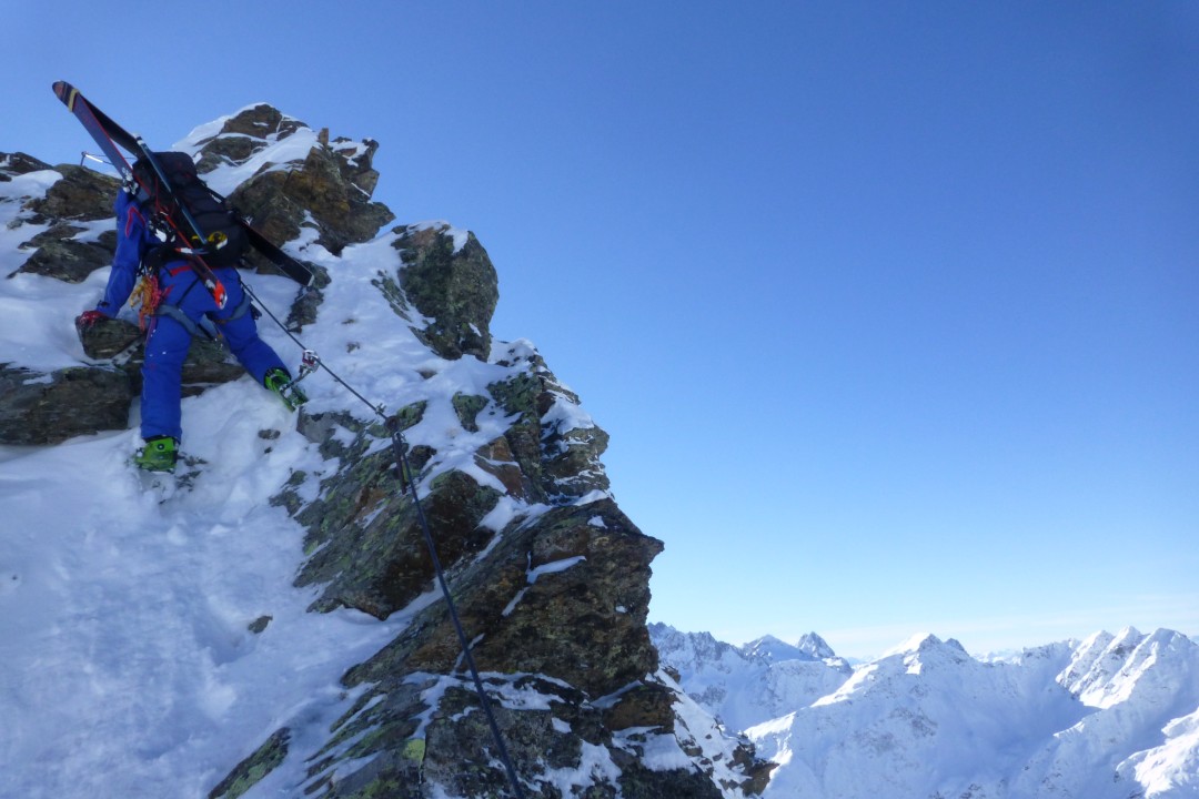 Die Skier sind auf den Rucksack geschnallt, was die Sache auch nicht leichter macht. Nicht nur wegen des Gewichts, sondern weil man mit den Skispitzen immer wieder in Konflikt mit dem teils über dem Kopf verlaufenden Drahtseil und den eigenen, dort eingehängten Bandschlingen gerät. Sie verhaken sich. Man muss sich bücken und um die eigene Achse drehen, was auf einem Grat eine verzichtbare akrobatische Nummer ist.